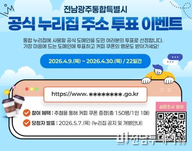 이상용 전남도 대변인은 “전남광주통합특별시의 정체성을 담은 누리집 주소 선정에 선호도 조사 결과를 적극 반영하겠다”며 “많은 관심과 참여 바란다”고 당부했다.