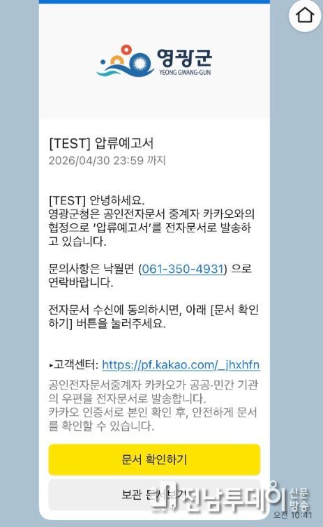 전남투데이 박세훈 기자 | 영광군은 4월 9일 지방세 30만 원 이상 고액체납자 767명을 대상으로 총 21억 1,300만 원의 체납액에 대해 「카카오 알림톡」으로 압류예고서를 발송했다고 밝혔다.
