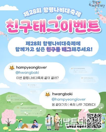 참여 희망자는 함평축제관광재단 인스타그램을 팔로우한 뒤, 게시글 댓글에 함께 방문하고 싶은 지인을 태그하고 ‘축제에 함께 가자’는 메시지를 남기면 된다. 태그된 이용자가 댓글에 답글을 작성하고, 네이버 폼을 통해 개인정보를 제출하면 참여가 완료된다.