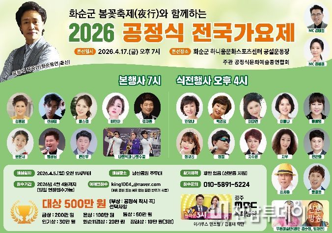 전남투데이 강영선 기자 | 화순군은 오는 4월 17일 16시부터 ‘2026 화순 공정식 전국 가요제’를 화순 공설운동장 특설무대에서 개최한다고 밝혔다.