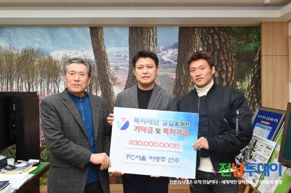 [전남투데이 윤진성 기자]지난 12월 31일 국가대표 축구선수로 좋은 활약을 펼치고 있는 영덕 출신의 FC서울 이명주 선수가 영덕군청을 방문해 복지재단설립을 위한 기탁금 및 복지기금 3천만원을 쾌척했다.
