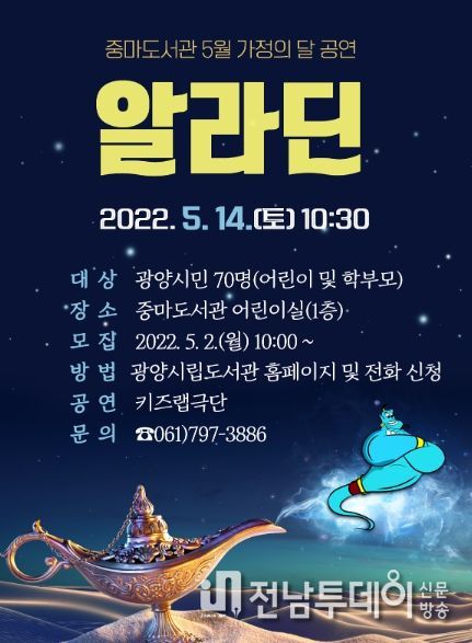 전남투데이 김석 기자 | 광양중마도서관은 5월 가정의 달과 어린이날 100주년을 기념해 오는 5월 14일 지역 내 어린이와 부모를 대상으로 뮤지컬 ‘알라딘’ 공연을 진행한다.
