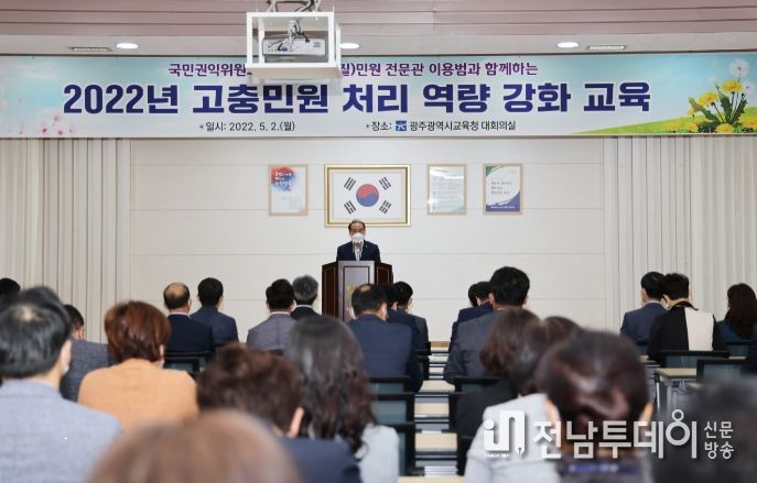 전남투데이 이정방 기자 | 광주시교육청이 2일 장휘국 교육감을 비롯한 본청 및 동·서부교육지원청 직원 400여 명을 대상으로 대면·비대면 방식을 활용해 ‘2022년 특별민원 대응 역량 강화 교육’을 실시했다.