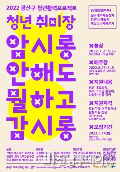 전남투데이 장은영 기자 | 광주 광산구가 2022 청년활력프로젝트 리빙랩 ‘청년 취미장, 암시롱 안해도 뭘하고 감시롱’의 참여자를 모집한다.