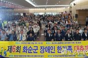 전남투데이 강영선 기자 | 전남 화순군은 9월 23일 (사)전남지체장애인협회 화순군지회(지회장 천기선) 주관으로 하니움문화스포츠센터에서 장애인과 비장애인이 함께하는 제6회 ‘화순군 장애인 한 가족 대축제’를 성황리에 개최했다고 밝혔다. 이날 행사에는 이호범 화순 부군수, 오형열 화순군의회 의장을 비롯해 전남도 22개 시·군 지체장애인협회 지회장, 군의원 및 기관사회단체장 등 주요 내빈과 장애인 가족, 자원봉사자, 지역 주민 등 500여 명이 함께해 장애인의 권익 증진과 지역사회 화합을 위한 뜻깊은 시간을 가졌다. 이번 행사는 ▲기념식 ▲유공자 표창 및 장학금 수여 ▲축사 ▲기념사진 촬영 ▲오찬 ▲축하공연 및 노래자랑 등으로 구성돼 풍성하게 진행됐다, 행사 준비는 전남지체장애인협회 화순군지회를 비롯해 ▲전남지적발달장애인복지협회 화순군지부(지부장 최영근) ▲한국시각장애인연합회 화순군지회(지회장 심재갑) ▲전남농아인협회 화순군지회(지회장 김훈) ▲전남신체장애인복지회 화순군지부(지부장 문종열) 등 5개 장애인 단체가 공동 주최했다. 행사에서는 장애인복지 발전에 기여한 유공자 14명에게 표창이 수여됐고,