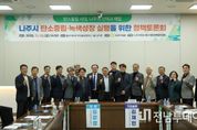 전남투데이 김윤걸 기자 | 나주시의회는 지난 11월 28일 동신대학교 혁신융합캠퍼스에서 에너지발전특별위원회 주관으로 '나주시 탄소중립·녹색성장 실행을 위한 정책토론회'를 개최해 지역 특성에 맞는 탄소중립 실천 전략과 중장기 산업전환 방향을 폭넓게 논의했다. 이번 토론회는 지난 10월 열린 ‘영산강 국가정원 탄소중립 포럼’의 연장선으로 탄소 감축 정책뿐 아니라 ‘에너지 수도 나주’의 미래 성장 전략까지 논의를 확장하는 후속 플랫폼으로 마련됐다. 참석자들은 기후위기 대응과 지역경제 발전을 동시에 달성하기 위한 실행 체계 구축의 필요성에 공감하며 시민·행정부·의회가 함께 만드는 지속가능한 지역 탄소중립 모델을 강조했다. 기조발제에 나선 ▲김재민 (사)지역경제녹색얼라이언스 대표는 나주시 배출구조를 기반으로 한 현실적 감축 전략과 국가정원 조성과 연계한 흡수원 확대, 분산형 에너지 모델, 지역 에너지 코디네이터 역할 등을 제시하며 탄소중립을 지역경제 활성화의 기회로 전환해야 한다고 강조했다. 이어진 패널토론에서는 ▲포천시 탄소중립센터 최광석 센터장이 도농복합도시의 녹색성장 사례와 마을단위 협의회 운영, 시민