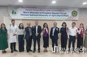 전남투데이 손영욱 기자 | 베트남국립농업대학교(VNUA) 총장이 전남대학교동물병원을 방문해 아시아 수의학 발전을 위한 학술 교류와 공동 연구 협력의 새로운 장을 열었다. 1일 전남대에 따르면 지난달 25일 전남대학교동물병원(병원장 이봉주 교수)에 베트남국립농업대학교(Vietnam National University of Agriculture, VNUA) 응우옌 티 란(Prof. Dr. Nguyen Thi Lan) 총장이 대표단과 함께 찾았다. 응우옌 총장은 수의학 박사이자 제14·15대 하노이시 국회의원을 지낸 인물로, 현재 VNUA 총장이자 당 위원회 서기(Party Committee Secretary)를 맡고 있다. 베트남 내 대표적인 수의학 전문가로 꼽히며, 대학 동물병원 및 수의학 교육·연구 분야에 높은 관심을 보여 이번 방문이 성사됐다. 이날 전남대에서는 이봉주 동물병원장, 박상익 수의과대학장, 김하정 내과 교수, 김세은 외과 교수, 노웅빈 응급의학과 교수를 비롯한 주요 보직자가 함께했으며, VNUA 대표단 7명도 동행했다. 대표단은 CT·MRI 등 첨단 영상진단 장비와 처치실