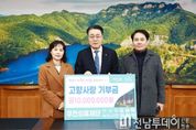 전남투데이 강영선 기자 | 화순군은 지난 23일 무진의료재단 김재택 이사장과 배우자 이정아 부이사장이 화순군청을 방문해 각 500만 원씩 총 1,000만 원의 고향사랑기부금을 기탁했다고 밝혔다. 두 기부자는 이번 기탁과 함께 4년 연속 고액기부를 이어오고 있으며, 2026년 제1호 고액 기부자로 이름을 올리는 등 지역사회의 귀감이 되고 있다. 기탁된 소중한 기부금은 화순군의 주민 복리 증진 및 지역 공동체 활성화를 위한 다양한 사업의 재원으로 투입되어 지역 발전에 쓰일 예정이다. 김재택 이사장은 “고향사랑기부제를 통해 화순의 발전을 응원할 수 있어 오히려 감사한 마음”이라며, “기부금이 지역사회와 취약계층을 위한 소중한 자원으로 의미 있게 쓰이길 바란다”라고 전했다. 이정아 부이사장도 “화순에서 병원을 운영하며 늘 지역과 함께해 왔다”라며, “부부가 함께 실천할 수 있는 가장 뜻깊은 나눔으로 고향사랑기부제를 선택했고, 앞으로도 꾸준히 고향 사랑을 실천해 나가겠다”라고 밝혔다. 주창현 자치행정과장은 “화순의 변화와 발전을 위해 4년 연속 한결같은 마음으로 나눔을 실천해 주신 두 분께 진심