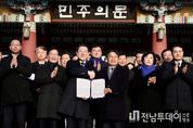 전남투데이 김용희 기자 | 전라남도와 광주시가 병오년 새해를 맞아 2일 국립5·18민주묘지에서 대한민국 민주화의 상징인 오월 영령들 앞에서 광주·전남 대부흥의 새 역사를 열어가기 위해 양 시·도 대통합을 즉각 추진하기로 선언했다. 김영록 전남도지사와 강기정 광주시장은 이날 국립5·18민주묘지를 참배한 후 민주의 문 앞에서 광주시와 전남도를 통합한 ‘통합 지방정부’ 설치 추진을 위한 공동선언문을 발표했다. 전남도와 광주시는 AI·에너지 대전환 시대, 남부권 반도체 벨트의 중심축이자 대한민국 미래 핵심 거점으로 도약할 역사적 전기를 맞아 통합 추진이 필요하다는 데 공감대를 형성했다. 특히 이재명 정부에서 통합 시·도에 대해 서울특별시에 준하는 지위와 조직특례를 부여하고, 교부세 추가 배분 및 공공기관 우선 이전 등 과감한 인센티브를 계획하고 있어, 지금이야말로 광주·전남이 대통합의 길로 나아갈 절호의 기회라고 보고, 이번 공동 선언을 통해 통합을 즉각 추진하기로 합의했다. 양 시·도는 통합의 시너지 효과를 극대화하기 위해 정부의 과감한 재정·권한이양과 특례 확보에 최선을 다하고, 미래지향적 성장동력을