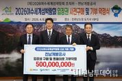 전남투데이 조평훈 기자 | (재)2026여수세계섬박람회조직위원회는 4월 8일 전라남도청 도지사실에서 전남개발공사와 ‘2026여수세계섬박람회 입장권 구매약정식’을 갖고, 성공적인 행사 준비를 위한 협력에 나섰다. 이날 약정식에는 황기연 전라남도지사 권한대행, 정현구 여수시장 권한대행, 장충모 전남개발공사 사장, 김동극 전남사회복지공동모금회 사무처장, 김종기 조직위 사무총장 등이 참석했다. 전남개발공사는 총 5억 원 상당의 박람회 입장권을 구매하고 전남사회복지공동모금회에 기부해 도내 취약계층과 복지시설에 전달키로 했다. 이번 약정은 공공기관이 참여와 나눔을 동시에 실천한 사례로, 지역사회와 함께하는 박람회 준비에 의미를 더하고 있다. 장충모 사장은 “나눔을 통해 박람회의 성공 개최를 응원하게 되어 뜻깊다”며 “앞으로도 지역 상생과 사회적 가치 실현을 위한 노력을 이어가겠다”고 말했다. 김종기 조직위 사무총장은 “공공기관이 앞장서 박람회 참여와 나눔을 동시에 실천한 사례”라며 “앞으로 다양한 기관과 기업의 참여가 이어져 박람회 열기가 더욱 확산되길 기대한다”고 말했다. 한편, 2