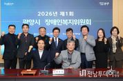 전남투데이 조평훈 기자 | 광양시는 2월 26일 시청 창의실에서 ‘2026년 제1회 광양시 장애인복지위원회’를 개최하고, 지역 장애인 복지정책 추진 현황을 점검하는 한편 향후 발전방안을 논의했다. 이번 회의는 위원장인 광양시장을 비롯해 장애인복지위원으로 위촉된 장애인복지분야 시설·단체장 등 총 10여 명이 참석한 가운데 2025년 광양시 장애인정책 주요 성과를 보고하고, 2026년 광양시 장애인 정책 시행계획(안)을 심의·의결하는 순으로 진행됐다. 광양시는 2025년 '제1차 광양시 장애인정책 종합계획'을 수립한 이후 ‘장애인 맞춤형 지원으로 모두가 행복한 감동도시 광양’ 실현을 비전으로 장애인의 권익 증진과 복지 향상에 힘써왔다. 올해에도 20개 과 36개 팀이 4대 중점과제를 중심으로 106개 사업(신규 7, 강화 36, 일반 63)을 추진하며 총 42,459백만원의 예산을 편성해 정책 추진에 박차를 가할 계획이다. 특히 주요 신규사업으로는 ▲중증장애인 저축형 통장 지원 ▲발달장애아동 치료비 지원 ▲의료·요양·돌봄 통합돌봄 지원 ▲광양시 공공산후조리원 이용료 전액 지원 ▲저소득장애인 건강검진비
