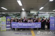 전남투데이 김경민 기자 | 광주교통공사(사장 조익문)가 ‘세계 여성 폭력 추방 주간(11월 25일~ 12월 1일)’을 맞아 25일 서구 상무역에서 인권 존중 문화 확산을 위한 유관 기관 합동 캠페인을 펼쳤다. 이날 행사에는 광주시, 광주여성가족재단, 광주여성의전화 등 관련 기관이 함께했으며, 참여자들은 도시철도 이용객을 대상으로 여성, 노인 등 사회적 약자에 대한 인식 개선 및 폭력 근절을 위한 다양한 홍보 활동을 전개했다. 특히 이번 캠페인에서는 인권 감수성 향상을 위한 즉석 퀴즈 이벤트를 포함해 시민이 직접 참여할 수 있는 현장 중심의 다채로운 프로그램들을 함께 진행해 큰 호응을 얻었다. 공사 조익문 사장은 “사회적 약자에 대한 존중과 배려가 지역 사회의 변화를 이끄는 힘이 되기를 기대한다”라며, “앞으로도 공기업으로서 사회적 책임을 다하는 데 앞장서겠다”라고 말했다.