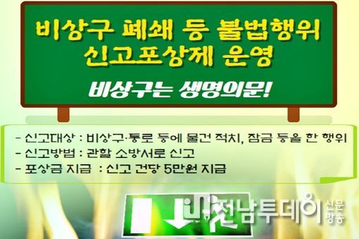 전남투데이 김호정 기자 | 목포소방서는 비상구 폐쇄·잠금·훼손 등 불법 행위에 대한 시민의 자발적인 신고와 건물 관계인의 자율안전 관리 의식 향상을 위해 연중 실시 중인 신고포상제를 3월부터 5월까지 집중적으로 운영하여 안전 무시 관행 근절에 앞장선다고 밝혔다.