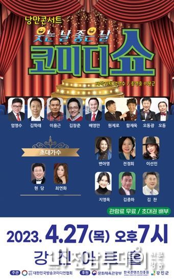 전남투데이 박동운 기자 | 강진군은 왕년의 코미디 개그 스타와 함께하는 낭만콘서트 코미디쇼 ‘웃는날 좋은날’ 공연을 오는 4월 27일 오후 7시 강진아트홀 대공연장에서 무료로 진행한다고 밝혔다.