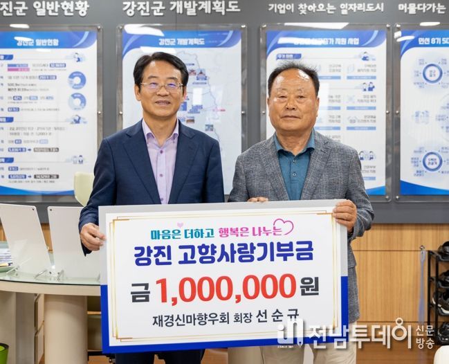 강진군은 지난 14일 마량면 재경신마향우회 선순규 회장이 강진을 사랑하는 마음을 담아 고향사랑기부금 100만 원을 기탁했다고 밝혔다.