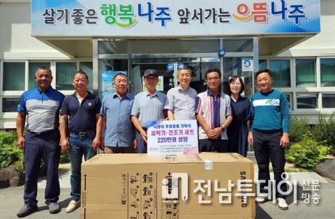 전남투데이 김윤걸 기자 | 나주시 다도면은 최근 김대곤 전면장, 자율방범대, 최종필 송학2리 이장이 세탁기, 건조기 1대를 행정복지센터에 기탁했다고 30일 밝혔다.