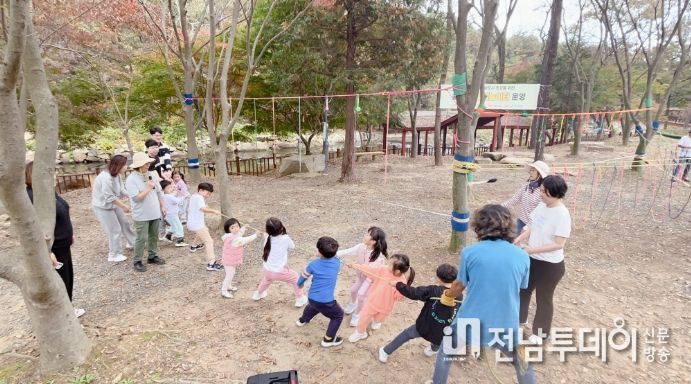 전남투데이 박동운 기자 | 강진군이 지난 4일, 도암면 석문공원에서 아동들에게 숲밧줄을 나무와 연결해 놀이시설을 제공하는 팝업놀이터를 운영, 큰 호응을 얻었다.