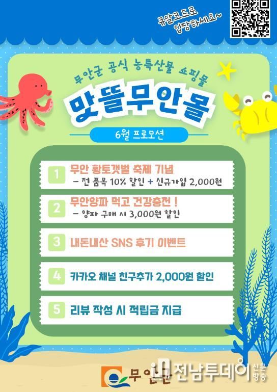 맛뜰무안몰 회원에게 전 상품 10% 할인쿠폰(6.9.부터 30.)을 지급하고 신규 회원에게는 2천 원 추가 쿠폰(6.1.부터 30.)을 지급한다.