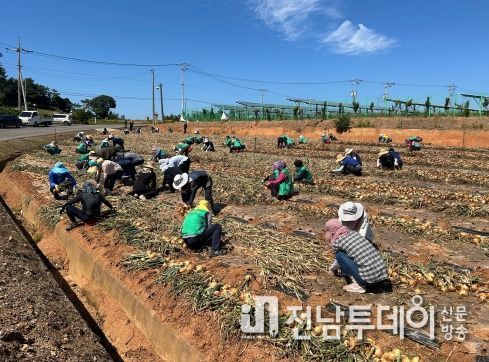 이날 현경면·무안군청 직원, 각 마을 부녀회장 등 60여 명이 참여하여 일손 부족으로 어려움을 겪는 현경면 용정리 농가를 찾아 양파 뽑기 작업에 구슬땀을 흘렸다.