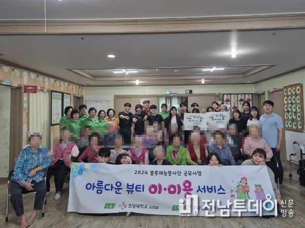 이번 사업은 전라남도 자원봉사센터 주관 2024 블루재능봉사단 우수프로그램 공모사업에 초당대학교 아라한 동아리가 선정되어 추진됐으며, 노인복지시설에 계시는 어르신들께 이․미용, 염색, 네일아트, 마사지 등의 뷰티케어 서비스를 해드렸다.