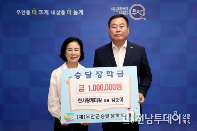 전남투데이 안철우 기자 | 전남 무안군은 5일 한사랑케미칼 김순이 대표가 지역인재 양성을 위해 소중히 써달라며 장학금 100만 원을 (재)무안군승달장학회에 기탁했다고 밝혔다.
