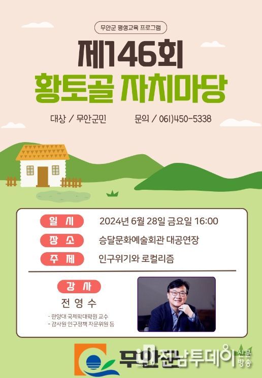 전남투데이 안철우 기자 | 전남 무안군은 오는 28일 승달문화예술회관 대공연장에서 전영수 한양대 국제학대학원 교수를 초청하여 ‘인구위기와 로컬리즘’를 주제로 제146회 황토골 자치마당을 개최한다.