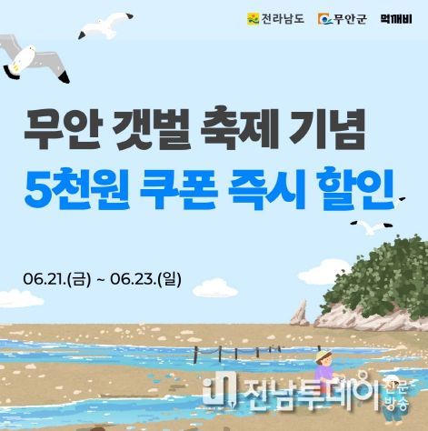 전남투데이 안철우 기자 | 전남 무안군은 6월 21일부터 23일까지 3일간 열리는 무안황토갯벌축제를 맞아 공공배달앱 먹깨비 할인쿠폰 제공과 전기기차 탑승료 지역화폐 환급 이벤트를 실시한다.