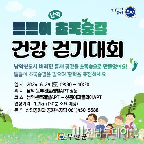 전남투데이 안철우 기자 | 전남 무안군은 6월 29일 오전 9시 30분 남악 동부센트레빌 아파트 정문에서 출발하는 ‘남악 틈틈이 초록숲길 건강 걷기대회’를 개최한다.
