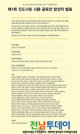 [전남투데이 윤진성 기자]진도 어민들의 바다 내음 가득한 삶의 풍경을 담은 김회권씨의 ‘진도 벌포마을’이 제1회 진도사랑 시 ‘여가 진도여’ 공모전 대상으로 선정됐다.