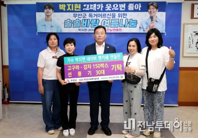 전남투데이 안철우 기자 | 전남 무안군은 지난 26일 미스터트롯 가수 박지현의 팬카페 전남‘엔돌핀’이 독거어르신을 위해 고구마·감자 150박스와 선풍기 30대를 무안군 사회복지협의회에 기탁했다고 밝혔다.