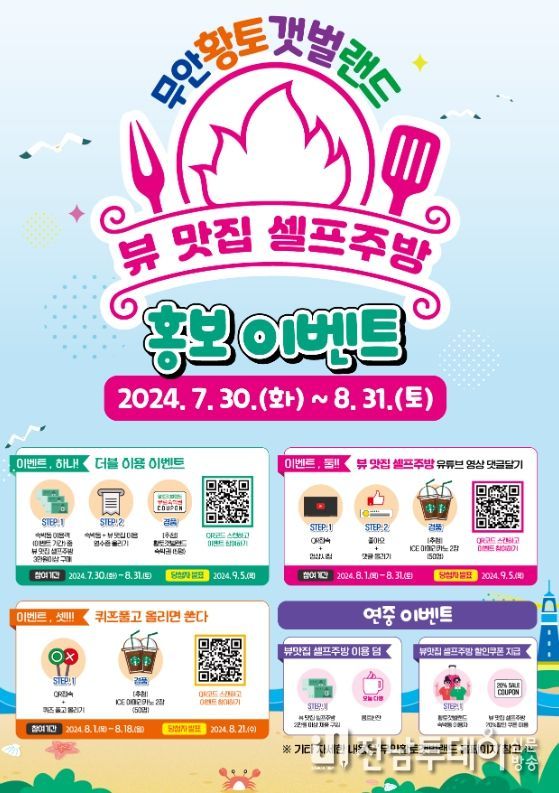 전남투데이 안철우 기자 | 전남 무안군은 무안황토갯벌랜드 뷰맛집 셀프주방 온오프라인 홍보 이벤트를 진행한다.