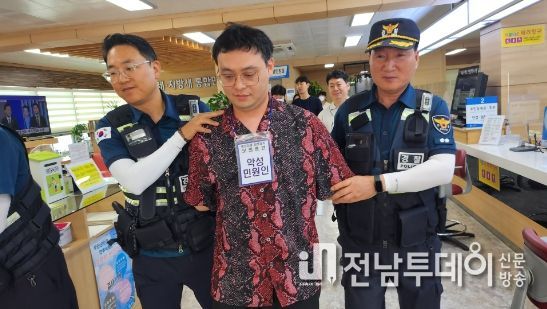 전남투데이 안철우 기자 | 전남 무안군은 지난 13일 군청 민원실에서 무안경찰서와 합동으로 ‘2024년 하반기 민원실 특이(악성)민원 발생 대비 모의훈련’을 진행했다.