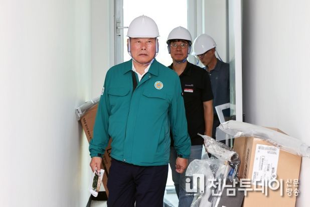 전남투데이 안철우 기자 | 김산 무안군수는 14일 현경면 외반리에 조성 중인 농업근로자 기숙사 신축공사 현장을 점검하며 농업인력 부족 문제를 해소하기 위한 적극적인 노력을 당부했다.