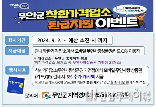 전남투데이 안철우 기자 | 전남 무안군은 올해 연말 예산 소진 시까지 착한가격업소 이용자를 대상으로 모바일 무안사랑상품권 추가할인(5% 캐시백)을 지원한다.
