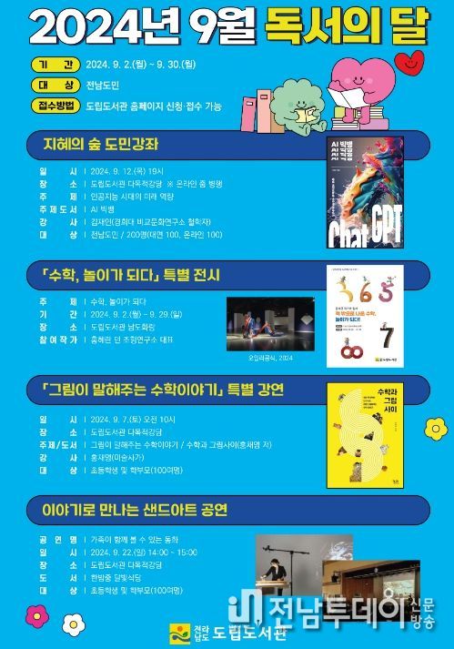 전남투데이 김완규 기자 | 전남도립도서관이 9월 독서의 달 도민의 독서문화 향유를 위한 특별 전시와 강연, 공연, 체험 등 다채로운 복합문화행사를 개최하고 있다.