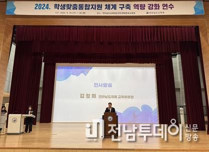 전남투데이 김완규 기자 | 전라남도의회 교육위원장 김정희 의원(더불어민주당ㆍ순천3)이 9월 25일 전라남도교육청순천만생태문화교육원에서 열린 ‘2024년도 학생맞춤통합지원 역량 강화 연수’에 참석하여 “모든 학생이 균등한 교육기회를 누릴 수 있도록 개별 학생의 특성에 맞는 맞춤형 지원을 펼쳐줄 것”을 당부했다.