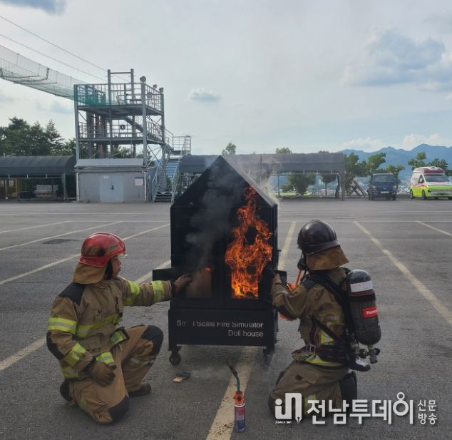 전남투데이 김완규 기자 | 전남소방본부는 26일 재난 현장에 강한 소방관 양성을 위해 ‘화재시뮬레이터(인형의 집)’을 활용해 제10기 소방위 관리역량 교육생 39명을 대상으로 실제 상황과 같은 화재재현 훈련을 실시했다.