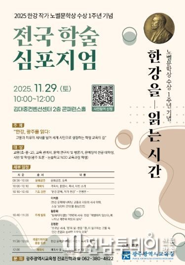 전남투데이 정홍균 기자 | 광주시교육청은 오는 29일 오전 10시 서구 김대중컨벤션센터 콘퍼런스홀에서 한강 작가의 노벨문학상 수상 1주년을 기념하는 ‘전국 학술 심포지엄’을 개최한다.