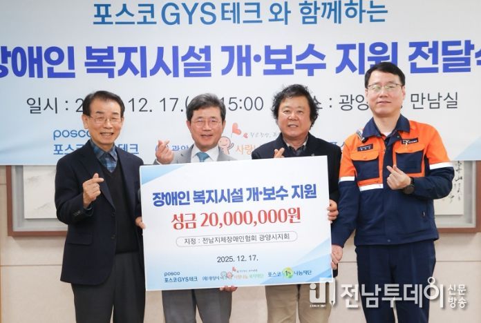 전남투데이 조평훈 기자 | 광양시는 지난 17일 포스코GYS테크가 사회복지시설 개·보수를 위한 지정기탁금 2천만 원을 전남지체장애인협회 광양시지회에 전달했다고 밝혔다.