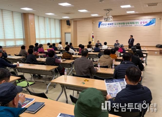 전남투데이 박세훈 기자 | 무안군은 해제면 도시재생 활성화계획(안)에 대한 공청회를 주민과 관계 전문가 등 60여 명이 참석한 가운데 지난 6일 해제면 주민다목적센터 강당에서 개최했다고 밝혔다.