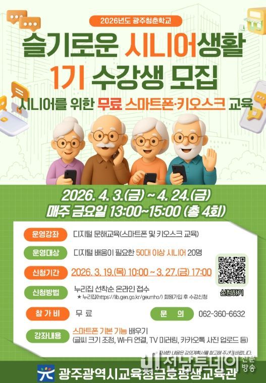 전남투데이 김경민 기자 | 광주시교육청금호평생교육관은 오는 4월 3일부터 7월 31일까지 50대 이상 시니어를 대상으로 디지털 역량 강화 프로그램인 ‘2026 슬기로운 시니어생활’을 운영한다.