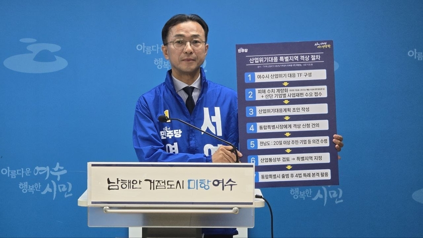한편, 서 예비후보는 "산업위기대응특별지역으로 격상되면 KTX 고속화·공항·전력·폐수처리시설 등 기반시설 국비 우선 지원과 통합특별법 제226조 보조금·재정투융자 우대 지원이 실질적으로 작동한다"고 설명하면서, “여수시는 전문가로 구성된 회의체를 구성하여 잘 준비해야 하며, 당장 산업위기대응특별지역 신청에 나서야 한다”고 주장했다.