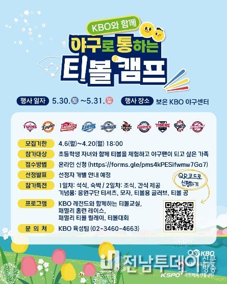 전남투데이 박세훈 기자 | KBO는 ‘2026년 야구로 통하는 티볼캠프’에 참가할 가족을 오늘(4월 6일)부터 20일(월) 오후 6시까지 모집한다.