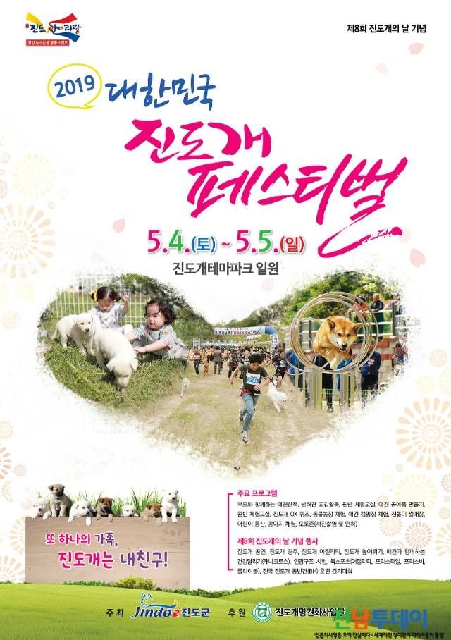 [전남투데이 윤진성 기자]천연기념물 제53호 진도개의 우수성을 알리고 2019년 진도개의 날을 기념하기 위해 오는 5월 4일(토)부터 5일(일)까지 2일 동안 진도개 테마파크 일원에서 ‘제8회 대한민국 진도개 페스티벌’이 개최된다.
