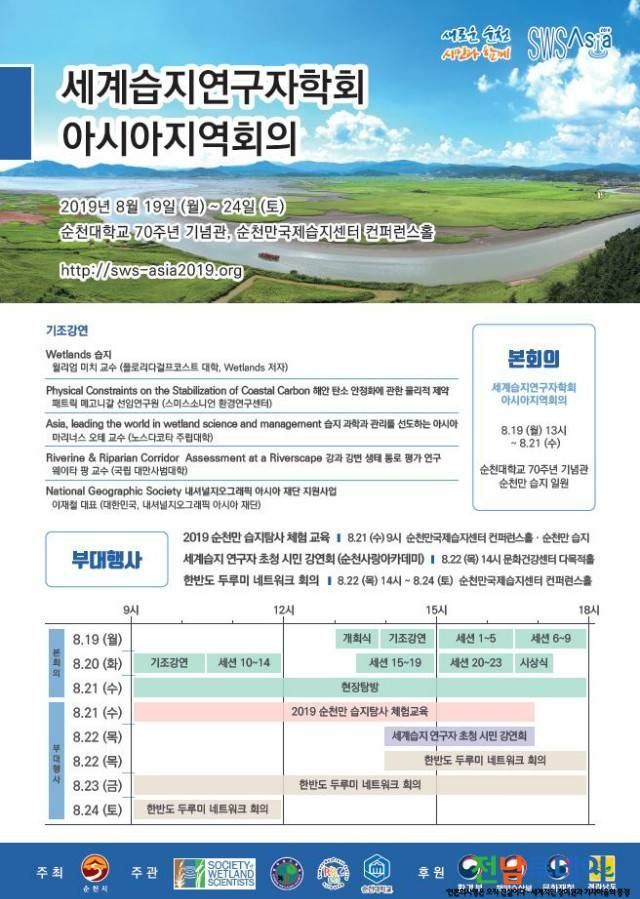 【전남투데이 구정준 기자】순천시(시장 허석)는 8월 19일(월) ~ 24일(토)까지 6일간 아시아 습지연구자들의 최대 학술대회인 ‘세계습지연구자학회 아시아지역회의’를 순천대학교 70주년 기념관과 순천만국제습지센터 일원에서 개최한다고 밝혔다.