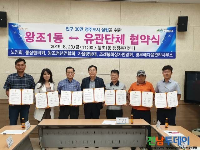 【전남투데이 구정준 기자】순천시 왕조1동행정복지센터(동장 장순모)는 지난 23일(금) 관내 6개 유관단체 및 아파트 관리소와 “인구 30만 정주도시 실현을 위한 업무협약”을 체결했다.