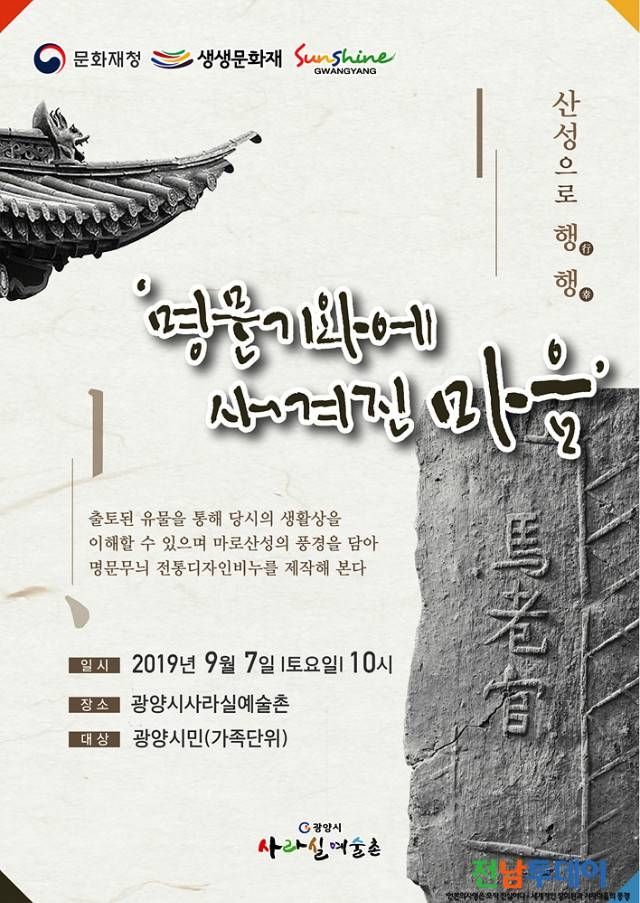 【전남투데이 구정준 기자】광양시 사라실 예술촌(촌장 조주현)에서는 오는 7일(토) 2019년 문화재청 공모사업으로 선정된 생생 문화재 사업 ‘성(城) 돌 사이에 피어난 현호색(마로산성)’ 중 ‘산성으로 행(行)행(幸)’ 프로그램을 진행한다고 밝혔다.