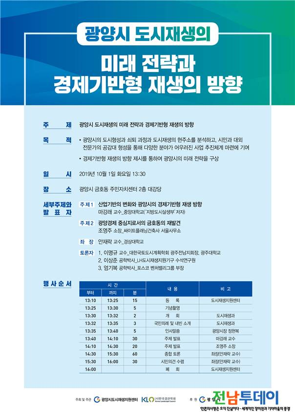 이번 심포지엄은 ‘광양시 도시재생의 미래전략과 경제기반형 재생의 방향’을 주제로 열리며, 경상대학교 안재락 교수를 좌장으로 중앙대학교 마강래 교수의 ‘산업기반의 변화와 광양시의 경제기반형 재생방향’ 기조 발표와 ‘광양경제 중심지로서의 금호동의 재발견’ 에 대한 싸이트플래닝건축사 조영주 소장의 발표로 진행된다.