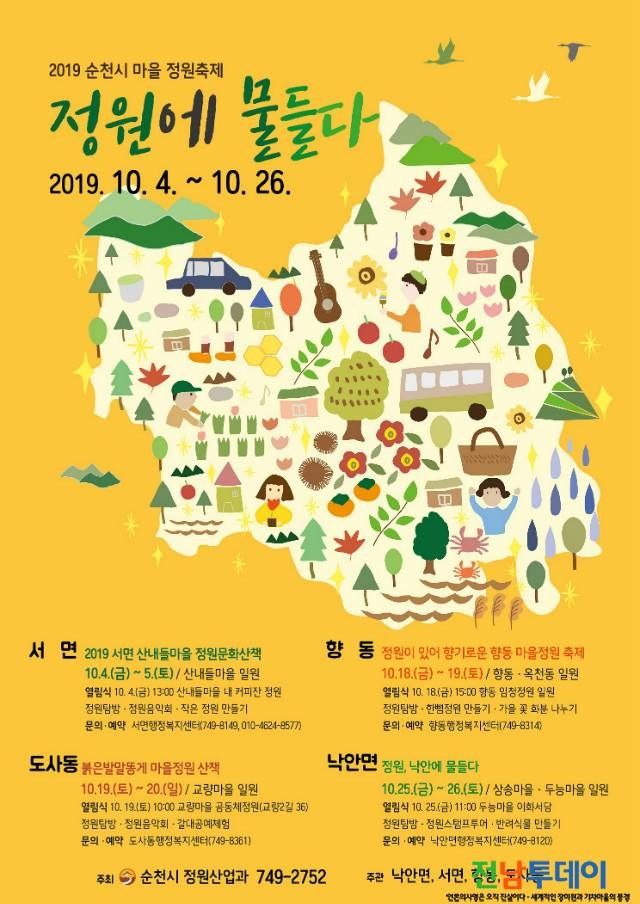【전남투데이 구정준 기자】순천시에서는 오는 10월 4일(금) ~ 10월 26일(토)일까지 아름다운 개인정원과 마을정원을 개방해 방문객들이 자유롭게 정원을 관람하며, 다양한 정원문화 콘텐츠를 즐길 수 있는 2019 순천시 마을 정원축제 ‘정원에 물들다’가 개최된다.