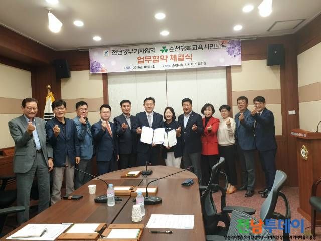 【전남투데이 구정준 기자】사)행복교육시민모임(이하 행교시) 순천지회(회장 조은주)와 전남동부기자협회(회장 김계수)는 오늘 오후 행복한교육복지국가실현과, 청소년진로체험,다문화가정의 문화활동등 지역사회발전과 삶의질 향상을 위해 서로 노력하기로 협약식을 갖고 본격적인 상호 협력에 들어갔다.
